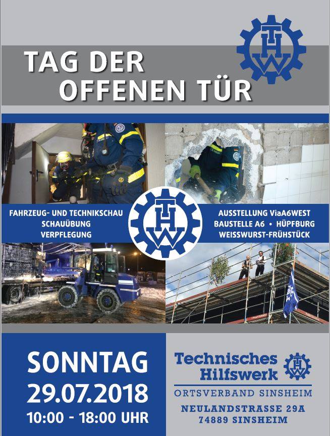 Sonntag 29. Juli 2018 von 10 -18 Uhr beim THW Sinsheim Mit einem "Tag der offenen Türe" möchten wir die Einweihung der Liegenschaft feiern. Zahlreiche Attraktionen und ein...