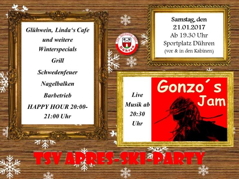 Samstag 21. Januar 2017 von 19.30 Uhr bis 04.00 Uhr am Sportplatz Dühren Nach dem großen Ansturm und positiven Feedback im letzten Jahr möchten wir auch 2017 mit euch die TSV...