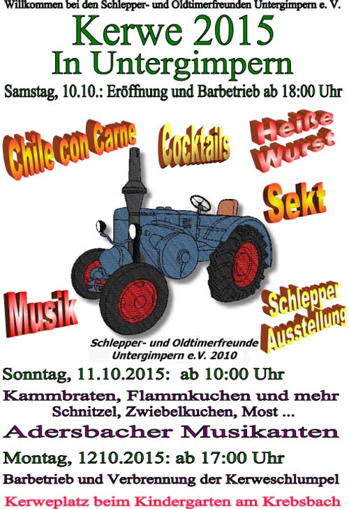 Einladung zu unserer Kerwe vom 10.10-12.10.2015 auf dem Kerweplatz beim Kindergarten am Krebsbach in Untergimpern.Am Samstag ab 18.00 Uhr Kerweeröffnung und Barbetrieb, Sonntag...
