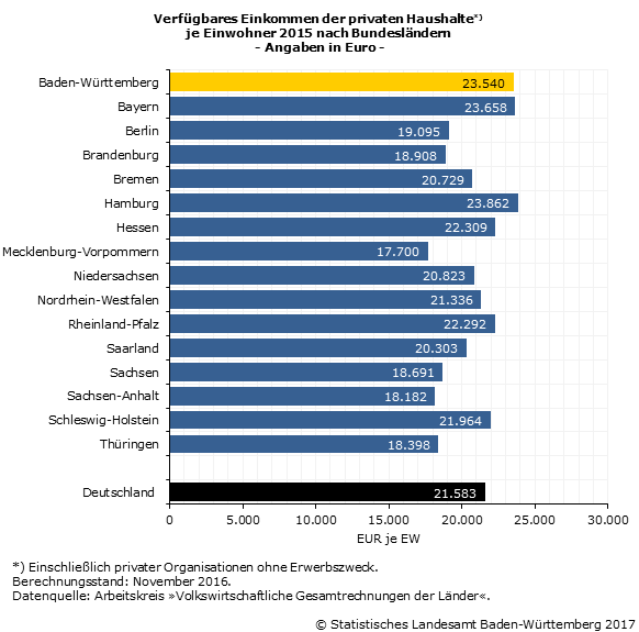 Baden‑Württemberg: Pro-Kopf-Einkommen lag 2015 bei durchschnittlich 23 540 Euro Das verfügbare Einkommen der privaten Haushalte1 nahm im Jahr 2015 in Baden‑Württemberg je...