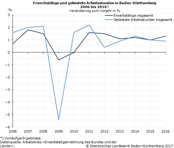 Hauptursache ist der Zuwachs an Erwerbstätigen um fast 80 000 Personen (zg) In Baden‑Württemberg stieg 2016 die Zahl der Erwerbstätigen jahresdurchschnittlich um 79 900 auf 6,16...