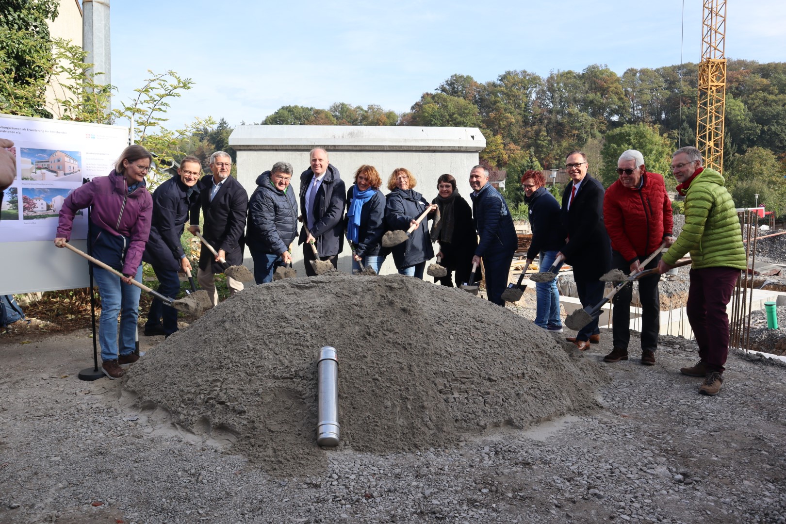 Landtagsabgeordneter Hermino Katzenstein, Stephanie Brecht als Vertretung für den Landtagsabgeordneten Dr. Albrecht Schütte, Oberbürgermeister Jörg Albrecht, Ortsvorsteher Edgar Bucher, Lothar Bauer und Tobias Schutz von Urbane Projekte, Architekt Martin Oszter sowie Vertreter des Aufsichtsrats und der Kirchen griffen gemeinsam mit Geschäftsführung und Mitarbeitenden der Kirchlichen Sozialstation zum Spaten für den symbolischen Auftakt der Bauarbeiten. Dekanin Christiane Glöckner-Lang sprach den Segen.