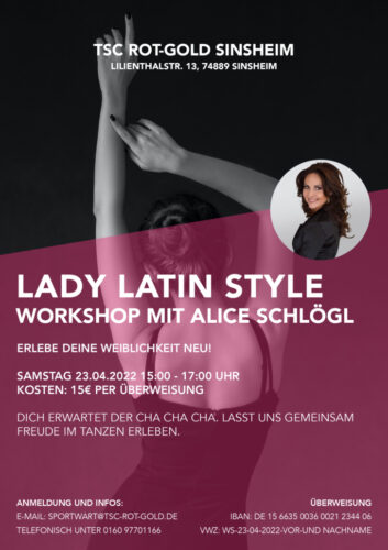 Alice Schögl bietet am 23.4.22 einen weiteren Workshop Lady Latin Style ausschließlich für Frauen an. Bereits im März fand ein Workshop mit dem Schwerpunkt „Rumba“ im TSC Rot-Gold statt. Die Frauen waren so begeistert, dass nun ein weiterer Workshop im TSC mit dem Thema „ChaChaCha – erlebe deine Weiblichkeit neu“ angeboten wird. Die Frauen können erfahren, wie insbesondere die Rolle des weiblichen Parts im Tanzen erlebt werden kann – und das mit viel Spaß.