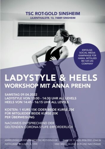 Am 09.04.2022 findet ein Workshop mit Anna Prehn statt. Ladystyle beschreibt eine Tanzrichtung, die gerade in der Werbebranche und in Musikvideos aktuell sehr gefragt ist. Es geht um Selbstbewusstsein, Sexiness und vor allem Spaß. Eine Mischung aus Commercial Pop mit weiblichen Moves zu guter Musik mit starken Beats mit und ohne „Heels“, d.h. bei Heels tanzen bewegen sich die meist weiblichen Tänzerinnen auf Schuhen mit hohen Absätzen. Die Herausforderung besteht darin, sich im Takt der Musik frei zu bewegen.