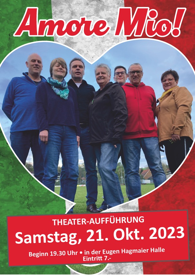 Das Angellocher Theater Team (ATT) wiederholt ihr erfolgreiches Stück vom Sommer mit dem Titel „Amore Mio“, frei nach der Komödie von Ute Tretter-Schlicker. Während der Pausen und im Anschluss an das Stück bietet Ihnen der TSV Speisen und Getränke an.