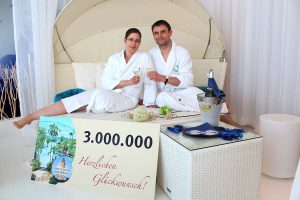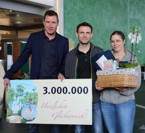 (zg) Um 10.20 Uhr war es soweit. Der 3 Millionste Besucher betrat die THERMEN & BADEWELT SINSHEIM. „Sind wir etwa bei Verstehen Sie Spaß?“, so die erste überraschte Reaktion von Oliver und Tanja Wochno aus Oedheim bei Heilbronn, die von Stephan Roth, Geschäftsleiter der Therme freudestrahlend begrüßt wurden.