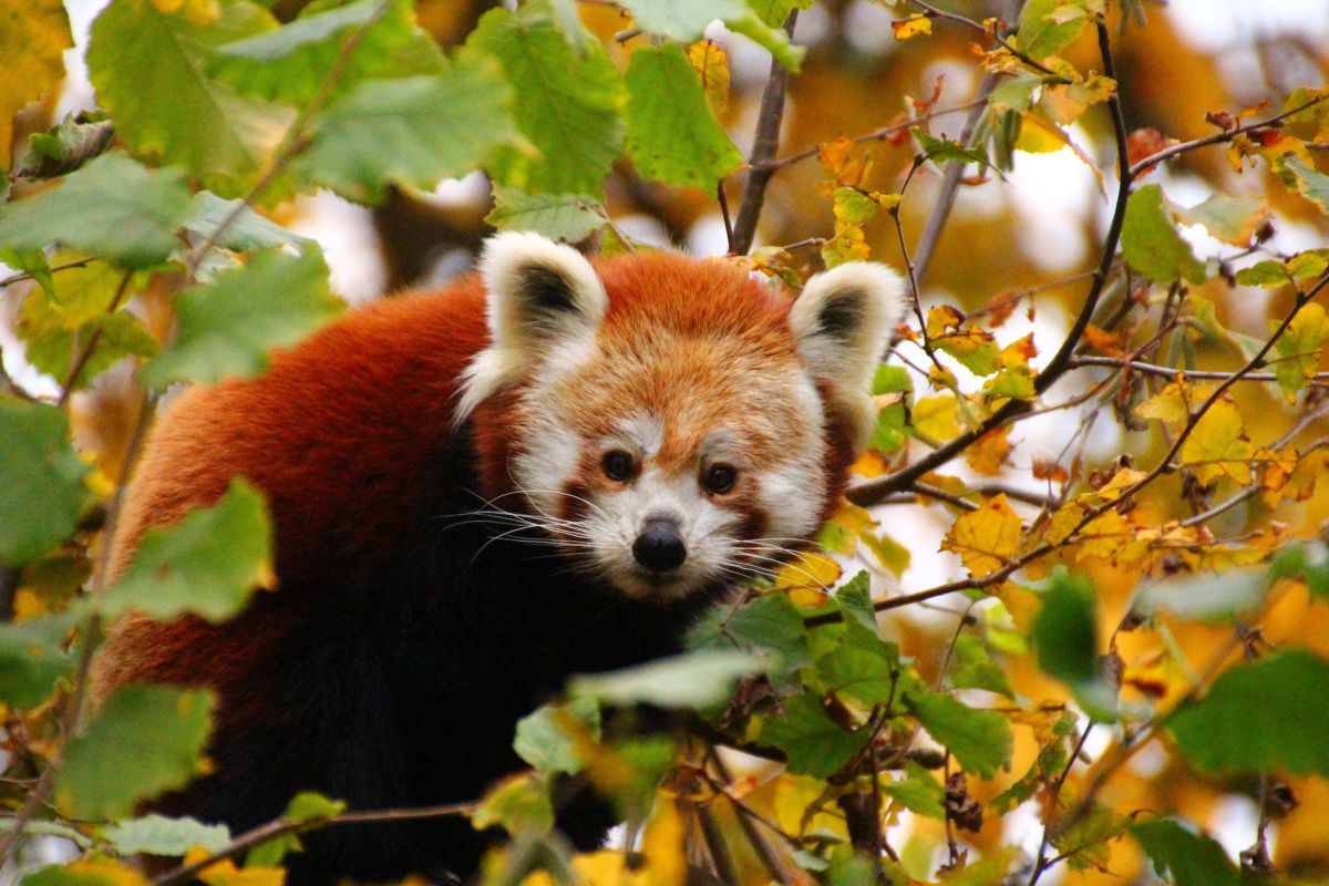 Herbstlicher Modetrend zeigt sich auch bei den Enten im Zoo. Jeder Erpel trägt jetzt sein auffällig gefärbtes Prachtgefieder, welches bei der Balz eine wichtige Rolle spielt. Obwohl die Brutzeit der meisten Wasservögel erst im Frühling beginnt, stellen die Erpel ihr farbenfrohes Gefieder schon jetzt zur Schau, um während der Wintermonate die Weibchen zu beeindrucken. Im Zoo Heidelberg zeigt sich die abwechslungsreich strukturierte Parklandschaft in warmen Herbsttönen. Besonders auffallend sind das leuchtende Gelb des amerikanischen Gelbholzbaums mitten auf der Flamingowiese und die in verschiedenen Rottönen schimmernden Amberbäume. Die herbstlich gefärbten Blätter bieten den Zootieren eine bunte Abwechslung sowohl im Speise- als auch im Beschäftigungsplan. Bedeuten die Laubmengen für die Tierpfleger erhebliche Mehrarbeit, scheuen sie dennoch keine Mühen, ihren Schützlingen besondere Unterhaltung zu bieten. Auf der neu gestalteten Bärenanlage wird das Laub zu großen Haufen geschichtet, durch welches sich die Syrischen Braunbären mit Freude wühlen und Lager bauen, in denen sie ruhen oder schlafen. 5889 - Kleiner PandaAuf recht eigenwillige Weise übt sich das junge Weibchen bei den Kleinen Pandas erstmals im Nestbau: unermüdlich klettert sie im Baum bis in die Spitze nach oben, um dort einzelne, welke Blätter zu pflücken und herunter auf den Boden zu bringen. Dort angekommen wird das frisch gepflückte Material an wechselnden Stellen zu einem „Probenest“ verbaut. Flink sind auch die Eichhörnchen vermehrt im Zoo unterwegs. Aufmerksame Besucher sehen sie geschäftig durch den Zoo flitzen. Sie sind dabei, ihre Vorratslager für den Winter füllen. Dazu vergraben sie die Nahrung in der Erde oder verstauen sie in Rindenspalten und Astgabeln. Zur Herbstzeit beginnt auch für die tierischen Zoobewohner die Kürbissaison. Als Abwechslung auf dem Speiseplan sind die großen gelben Panzerbeeren willkommen. Die Menschenaffen pulen beispielsweise sorgfältig die schmackhaften Kerne heraus, während die Löwen die Herbstfrüchte zerstören und sich mit Hingabe in den Überresten wälzen. Gut genährt bereiten sich andere Tiere auf die ruhigen Monate vor. So beginnt bei einigen Tieren, wie beispielsweise den Präriehunden, mit den kürzer werdenden Tagen auch die innere Uhr langsamer zu ticken. Die sonst so geschäftigen Tiere bekommt man nun seltener zu Gesicht, denn auch im Zoo halten sie etwa von November bis Februar eine leichte Winterruhe, die hin und wieder unterbrochen wird, um außerhalb des Baus ein paar Sonnenstrahlen zu genießen.