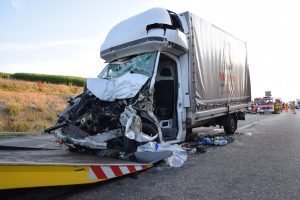 Bad Rappenau. (pol) Am Mittwoch gegen 18.30 Uhr staute sich der Lkw-Verkehr auf dem rechten Fahrstreifen der A 6 in Fahrtrichtung Nürnberg auf Höhe Heilbronn-Biberach. Der 55-jährige Fahrer eines tschechischen Sprinters bemerkte diesen Umstand offensichtlich zu spät. Obwohl er noch versuchte leicht nach rechts zu lenken, konnte er nicht verhindern, dass er mit großer Wucht gegen die rechte hintere Ecke eines Sattelzuges prallte. Dabei erlitt der Fahrer schwerste Verletzungen, denen er noch an der Unfallstelle erlag. Der entstandene Sachschaden beträgt ca. 35.000 Euro. Für die Bergung und Versorgung der Beteiligten musste die A 6 in Richtung Nürnberg bis 19.50 Uhr voll gesperrt werden.