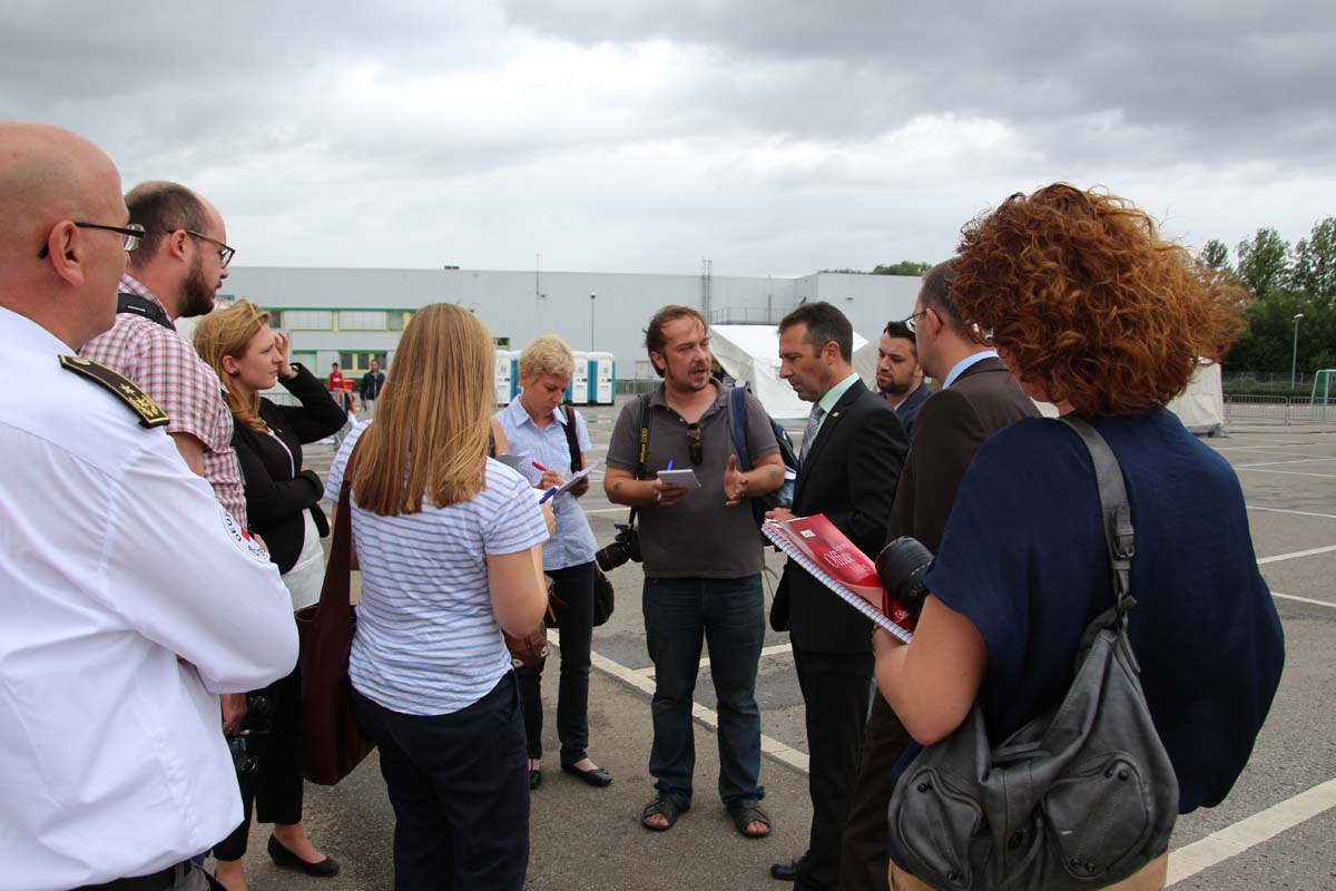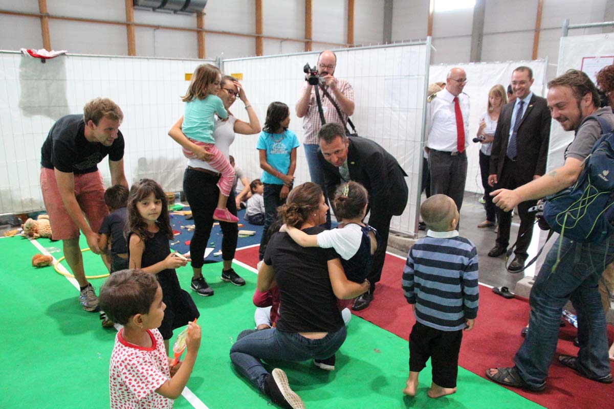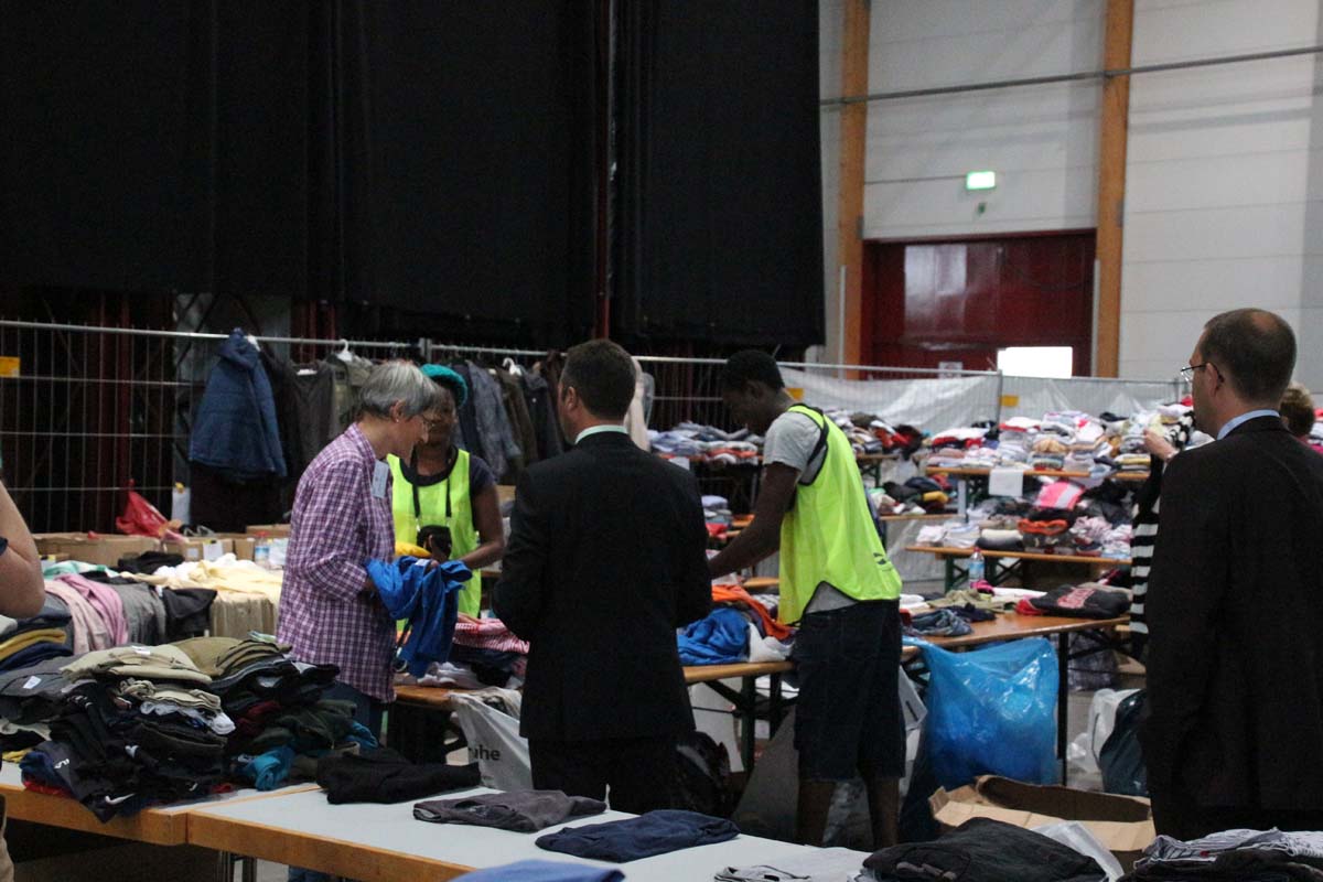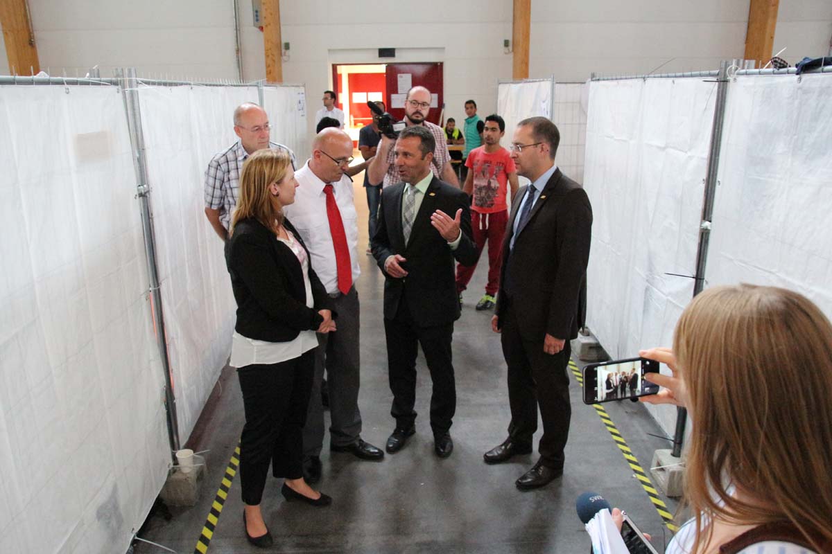 (cr) OB Jörg Albrecht überzeugte sich sofort nach seine Rückkehr aus dem Urlaub von dem reibungslosen Ablauf in der Flüchtlingsnotunterkunft in der Messe Sinsheim. Fast hätte er seinen Urlaub abgebrochen um bei den Helfern vor Ort mit Rat und Tat zur Seite zu stehen. Doch auch seine Stellvertreter Ulrich Landwehr und Tobias Schutz versorgten die Helfer mit jeder angeforderten Hilfe und Unterstützung. Besonderes Augenmerk lag natürlich beim Deutschen Roten Kreuz und den vielen freiwilligen ehrenamtlichen Helfern die trotzt der Belegung von fast 1000 Flüchtlingen ihre gute Laune und Hilfsbereitschaft nicht verlieren.