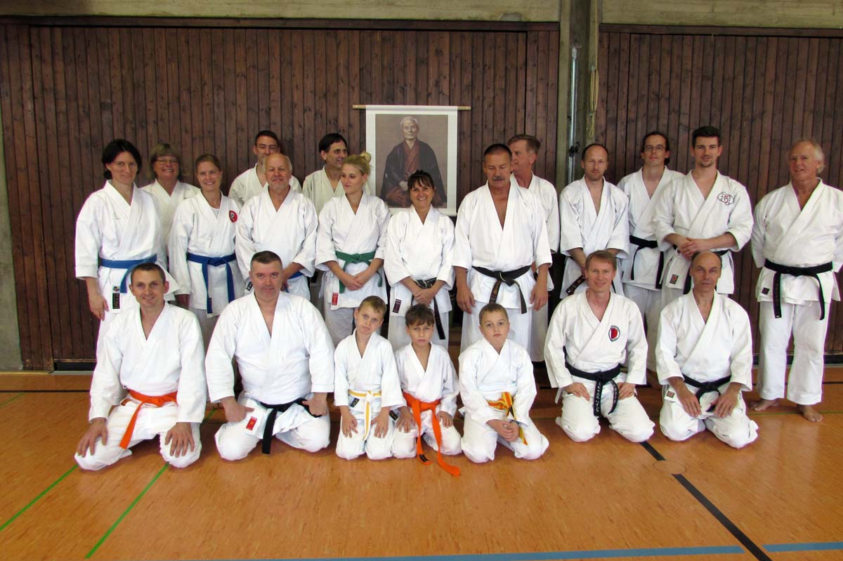 Am vergangenen Wochenende fand im Karate-Dojo wieder ein Top-Lehrgang mit dem weithin bekannten Karate-Meister Lothar Ratschke statt. Neben grundlegenden Bewegungsformen wurden vor allem verschiedene Kata (= Formen) und deren Anwendung mit einem Partner bzw. Angreifer geübt. Die reine Selbstverteidigungskunst geht dabei von einem körperlich überlegenen Angreifer aus. Demzufolge spielen bestimmte Prinzipien wie das gleichzeitige Abwehren und Gegenangreifen, das Umleiten der Kraft des Angreifers und das Treffen empfindlicher und leicht verletzlicher Punkte eine wichtige Rolle. Diese Prinzipien und deren Entschlüsselung aus der Kata heraus wurden vom Meister eingehend behandelt.