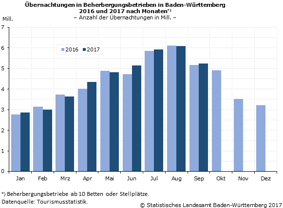 Bezüglich der Entwicklung für das gesamte Jahr 2017 geht das Statistische Landesamt derzeit davon aus, dass die Ergebnisse des Vorjahres übertroffen werden können. Das Tourismusgewerbe würde dann im achten Jahr in Folge zulegen. Voraussetzung dafür ist allerdings, dass sich die gute Entwicklung der ersten neun Monate 2017 im Restjahr fortsetzt und kein massiver Einbruch erfolgt.
