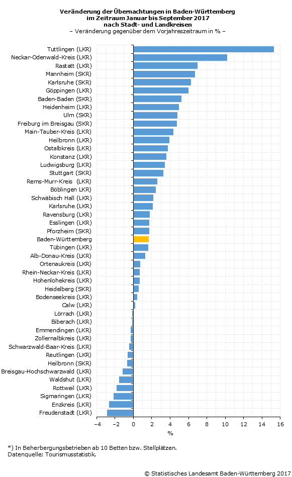 Die Auswertungen der Übernachtungszahlen der Monate Januar bis September 2017 auf Kreisebene zeigen größere Veränderungen. Hier kommen regionale oder örtliche Besonderheiten stärker zum Tragen. So bewegen sich die Veränderungsraten der Übernachtungen im Vorjahresvergleich zwischen dem Landkreis Freudenstadt mit der ungünstigsten (−2,9 %) und dem Landkreis Tuttlingen mit der günstigsten Entwicklung (+15,3 %) in einer beträchtlichen Spanne. Der Großteil der Stadt- und Landkreise Baden‑Württembergs konnte in den ersten neun Monaten 2017 das Ergebnis des Vorjahreszeitraums verbessern. Dabei verzeichneten sechs Kreise (Landkreis Tuttlingen, Neckar-Odenwald-Kreis, Landkreis Rastatt, Stadtkreis Mannheim, Stadtkreis Karlsruhe, Landkreis Göppingen) vergleichsweise starke Zuwächse von 6 % und mehr. Von den Kreisen, die das Vorjahresergebnis bislang nicht erreicht haben, wiesen der Landkreis Sigmaringen, der Enzkreis sowie der Landkreis Freudenstadt mit einem Minus bei den Übernachtungen zwischen 2 und 3 % die ungünstigste Entwicklung auf.