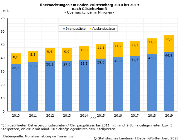 Das Reiseland Baden-Württemberg zieht nach wie vor überwiegend Gäste aus Deutschland an. 2019 kamen rund 77 % der insgesamt 23,3 Mill. Reisenden aus dem Inland und buchten rund 79 % der Übernachtungen. Demgegenüber stammten 5,4 Mill. bzw. mehr als 23 % der Gäste aus dem Ausland. Ihnen sind 12,2 Mill. bzw. gut 21 % der Übernachtungen zuzurechnen. Die positive Gesamtentwicklung des Landestourismus in den letzten Jahren ist nicht zuletzt auch darauf zurückzuführen, dass Baden-Württemberg für ausländische Touristen offenbar weiter an Attraktivität gewonnen hat: Während die Zahl der Gäste aus Deutschland gegenüber 2010 um gut 35 % stieg, wuchs die der Gäste aus dem Ausland um 54 %. Die Zahl der Übernachtungen von Touristen aus Deutschland stieg gegenüber 2010 um knapp 27 %, die der internationalen Gäste um rund 53 %.