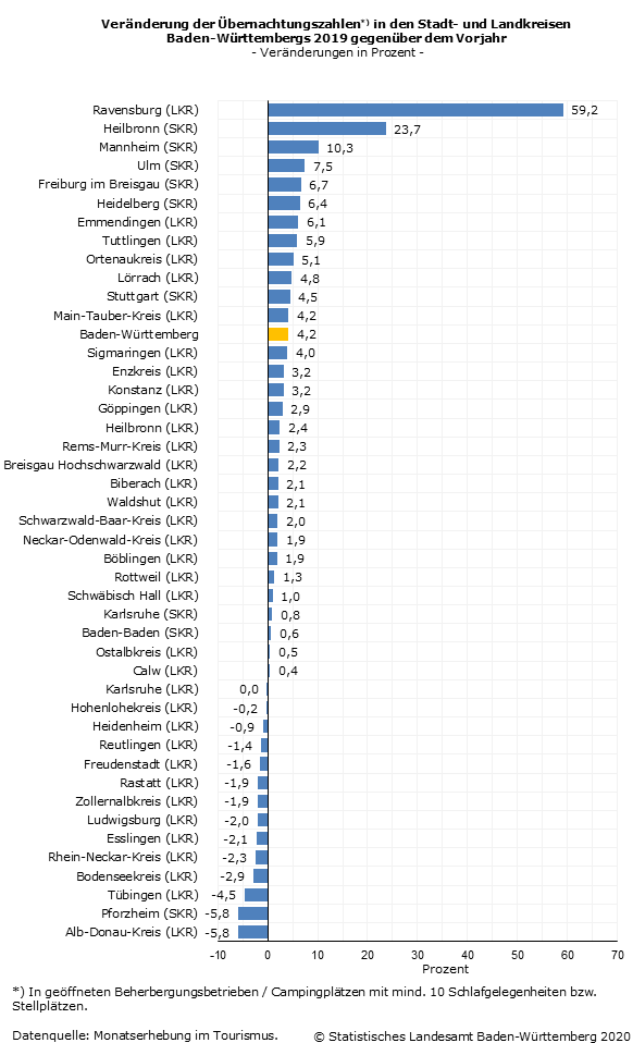 Bei der Analyse der regionalen Entwicklung der Übernachtungszahlen im Vergleich zu 2018 zeigt sich aber auch eine relativ breite Streuung: Das Feld reicht von einem Rückgang von 5,8 % im Alb-Donau-Kreis und im Stadtkreis Pforzheim bis zu einem Zuwachs von 59,2 % im Landkreis Ravensburg. Insgesamt 13 Stadt- und Landkreisen gelang es 2019 nicht, ihr Übernachtungsergebnis aus dem Vorjahr zu halten oder es zu verbessern. Darunter befanden sich mit dem Hohenlohekreis und dem Landkreis Heidenheim allerdings zwei Kreise, die ihr Vorjahresergebnis nur knapp, nämlich um 0,2 % bzw. um 0,9 % verfehlten.