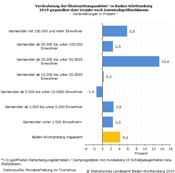 Die Auswertung nach Gemeindegrößenklassen zeigt, dass 2019 fast durchgängig ein gutes Jahr war: Fast alle Größenklassen zeigen Steigerungen bei den Übernachtungszahlen, wenn auch in unterschiedlichem Ausmaß. Die bedeutendsten Zuwächse verbuchten mit einem Plus von 13,4 % erneut die Gemeinden der Größenklassen 20 000 bis unter 50 000 Einwohner. Für Gemeinden der Größenklasse 5 000 bis unter 10 000 Einwohner hingegen brachte das Jahr 2019 im Vergleich zum Vorjahr ein Minus von 1,4 %.
