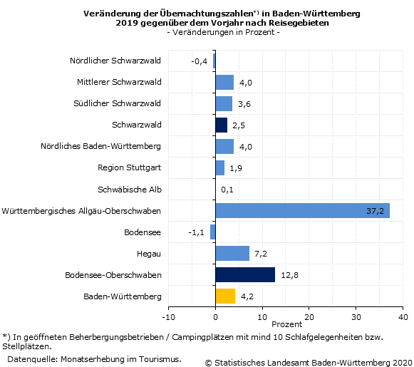 Die regionale Analyse der Übernachtungszahlen zeigt, dass sich der Landestourismus vor allem auf die Reisegebiete Schwarzwald (Marktanteil Übernachtungen 2019: rund 40 %), das nördliche Baden-Württemberg (knapp 18 %), die Region Stuttgart (gut 16 %) und den Bodensee (rund 9 %) konzentriert. Gegenüber dem Vorjahr haben sich die Übernachtungszahlen in nahezu allen Reisegebieten Baden-Württembergs erhöht. Besonders hohe Zuwächse verbuchten das Württembergische Allgäu-Oberschwaben (+37,2 %), der Hegau (+7,2 %) sowie der Mittlere Schwarzwald und das Nördliche Baden-Württemberg (beide +4 %). In den „Klassikern“ Nördlicher Schwarzwald (−0,4 %) und Bodensee (−1,1 %) hingegen schlug die Entwicklung ausgehend von traditionell hohen Übernachtungszahlen im Vergleich zum Vorjahr leicht ins Minus aus. Insgesamt betrachtet bilanziert das mit Blick auf den Marktanteil dominierende Reisegebiet Schwarzwald insgesamt für 2019 gegenüber dem Vorjahr einen Zuwachs von 2,5 % bei den Übernachtungen. Die Beherbergungsbetriebe im Reisegebiet Bodensee-Oberschwaben verzeichneten trotz leicht rückläufiger Übernachtungszahlen am Bodensee bei einem Marktanteil von gut 18 % ein sattes Plus von 12,8 %.
