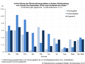 Auch in den für die Branche wichtigen Sommermonaten 2018 verzeichnete das Tourismusgewerbe in Baden-Württemberg überwiegend Zuwächse. Nach Feststellung des Statistischen Landesamtes kamen in den Beherbergungsbetrieben mit 10 und mehr Betten oder Stellplätzen im Vergleich zu den entsprechenden Vorjahresmonaten im Juli (+2,5 %), August (+3,0 %) und September (+2,3 %) jeweils mehr Gäste an. Bei den für das Gewerbe bedeutenderen Übernachtungen wurden die Ergebnisse der Vorjahresmonate ebenfalls übertroffen und zwar im Juli um 3,4 %, im August um 1,0 % und im September um 3,0 %.