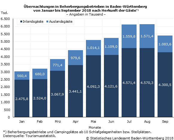 Für den gesamten Zeitraum Januar bis September 2018 wurden rund 17,2 Millionen (Mill.) Ankünfte und knapp 42,5 Mill. Übernachtungen gemeldet. Das waren 3,9 % mehr Gäste und 3,5 % mehr Übernachtungen als in den ersten neun Monaten 2017. Die Mehrheit der Gäste (rund 13,1 Mill. bzw. 76 %) hatte den Wohnsitz im Inland und buchte gut 33,2 Mill. Übernachtungen. Bei den Inlandsgästen ergab sich in den ersten neun Monaten 2018 somit bei den Ankünften ein Plus von 3,8 % und bei den Übernachtungen von 3,4 %.