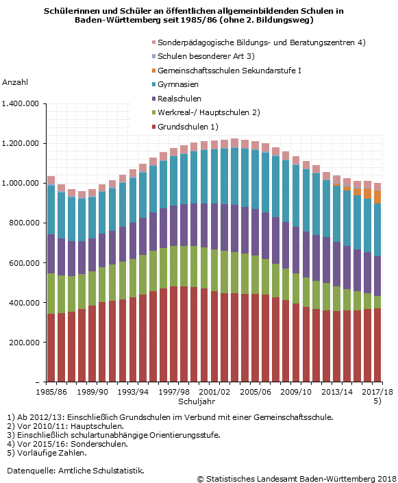 Nach den vorläufigen Ergebnissen der amtlichen Schulstatistik des Statistischen Landesamts besuchen im aktuellen Schuljahr in Baden-Württemberg knapp 1 001 000 Schülerinnen und Schüler eine öffentliche allgemeinbildende Schule. Dies sind knapp 10 000 weniger als im Vorjahr (−1,0 %). Der Trend einer rückläufigen Schülerzahlentwicklung, der ab dem Schuljahr 2004/05 einsetzte, verstärkt sich damit wieder leicht im Vergleich zum Vorjahr. Seit dem Schuljahr 2003/04 sank die Schülerzahl um gut 18 % auf ihr diesjähriges Niveau.