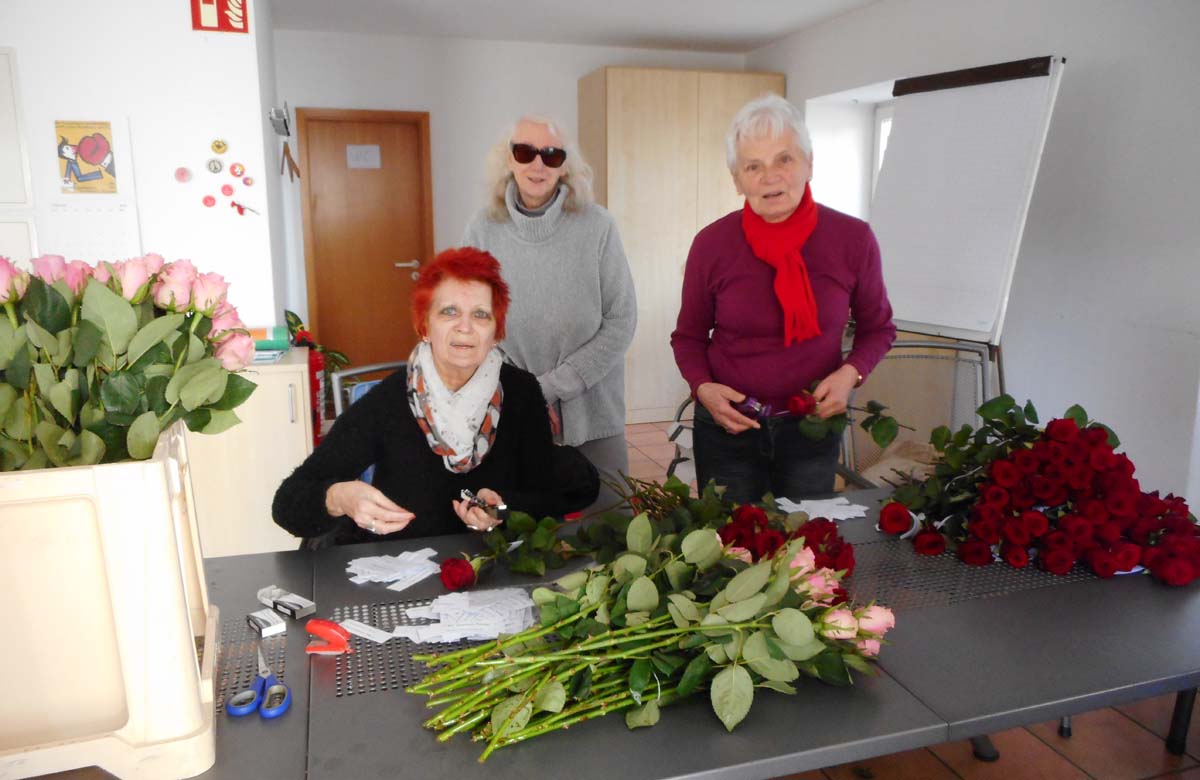 (zg) Sturm und Regen konnte ihnen, den drei starken Frauen in der SPD und überparteilichen Sinsheimer Frauengruppe nichts anhaben. Mit drei großen Rosensträußen (150 rote und rosa Rosen) ausgestattet, machten sich die Frauen auf den Weg und besuchten alle Geschäfte in der Fußgängerzone, um den arbeitenden Frauen eine rote Rose als Erinnerung an 100 Jahre Frauenwahlrecht zu überreichen. Der Internationale Frauentag wurde erstmals im Jahr 1911 von SPD-Frauen eingeführt und mit großer Begeisterung immer am 08. März eines Jahres gefeiert.