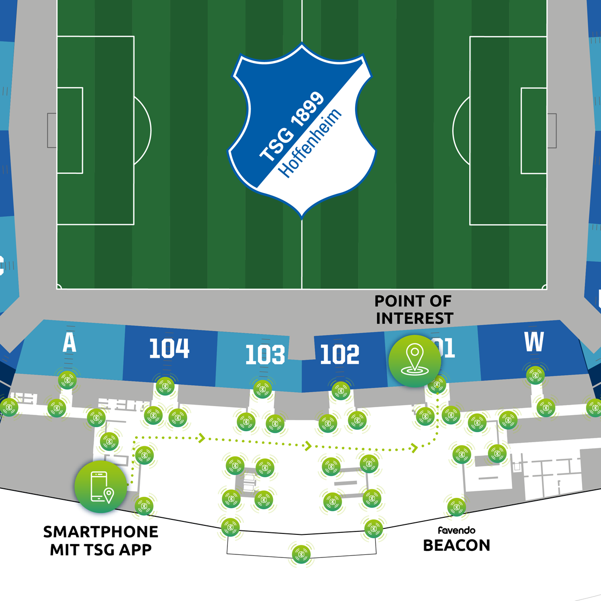 (zg) Das Bamberger Technologieunternehmen Favendo realisiert gemeinsam mit dem Fußball-Bundesligisten TSG Hoffenheim die bisher größte Beacon-Installation im deutschen Sport. In einem ersten Schritt werden dazu in der WIRSOL Rhein-Neckar-Arena in Sinsheim knapp 700 so genannte iBeacons montiert. Diese kleinen auf der Bluetooth-Technologie basierenden Sendemodule ermöglicht allen Nutzern, die auf ihrem Smartphone die TSG-Fan-App installiert und entsprechend eingerichtet haben, von der neuen Saison an eine interaktive Kommunikation sowie Navigation innerhalb des Stadions. Besucher können sich darüber hinaus über neueste TSG-Angebote informieren lassen. Die umfangreiche Installation ist die erste ihrer Art in einem Stadion der höchsten deutschen Spielklasse. Favendo hat bereits die SAP-Arena in Mannheim entsprechend ausgestattet.