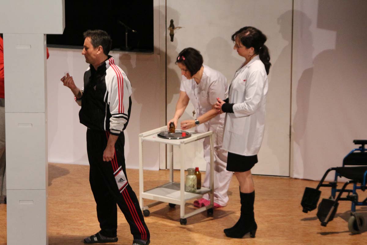 IMG_0143(cr) Vollbesetzte Aufführungen waren der Lohn des diesjährigen Theaterstückes “ Einer flog übers Kuckucksnest“ des Lehrertheater-Ensembles des Wilhelmi Gymnasiums im Musiksaal der Schule. Hier zeigten sie ihre zweite Berufung. Glänzend agierten die Lehrer als Schauspieler in diesem Stück. Dies wollten viele Theaterfreunde und Schüler nicht verpassen. Die Rollen waren alle blendend besetzt. Unter der Regie von Uta Kissenbeck agierten Gregor Gund, Dirk Mehlich, Tobias Wieland, Anne Schmehling, Jutta Stier, Axinja Roß, Karsten Grünberg, Johannes Senger-Bastian, Gudrun König, Michael Riedlberger, Renate Ehret, Sabine Zimmermann und Sigrid Koenemund. Ein besonderer Dank ging an Andy Münkel den guten Geist und immer zur Stelle wenn man ihn braucht. Das Stück ist hinreichend bekannt aus dem Kino mit Jack Nicholson in der Hauptrolle. Doch dieses Theaterensemble setzte dieses Stück von Dale Wasserman nach dem gleichnamigen Roman von Ken Kesey glänzend um und konnte dem Vergleich mit dem Film locker standhalten. Von uns Daumen hoch für einen absolut gelungenen Theaterabend.