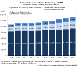 Im Jahr 2018 wurden nach Feststellung des Statistischen Landesamtes 132 374 erzieherische Hilfen ambulant, teilstationär oder außerhalb des Elternhauses durchgeführt (beendete und am Jahresende andauernde Hilfen). Damit stieg die Zahl der Hilfen zur Erziehung gegenüber 2017 um 3 328 oder 2,6 %. Die Kinder- und Jugendhilfe bietet ein breites Spektrum erzieherischer Hilfen an, wenn junge Menschen unter 27 Jahren ihre Probleme nicht alleine oder mit Hilfe ihrer Familie bewältigen können.