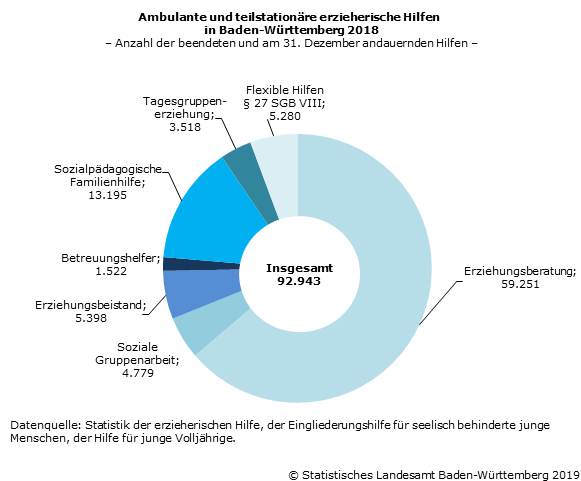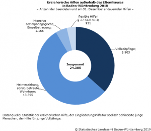 Komplettiert wird die Jahresbilanz zu den 2018 in Baden-Württemberg gewährten Hilfen zur Erziehung durch 12 194 Eingliederungshilfen für seelisch behinderte junge Menschen und 2 852 ergänzende bzw. sonstige (flexible) erzieherische Hilfen.