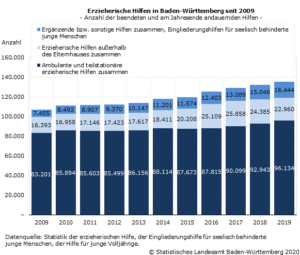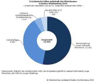 Komplettiert wird die Jahresbilanz zu den 2019 in Baden-Württemberg gewährten Hilfen zur Erziehung durch 13 430 Eingliederungshilfen für seelisch behinderte junge Menschen und 3 014 ergänzende bzw. sonstige (flexible) erzieherische Hilfen.