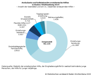 Im Jahr 2019 wurden nach Feststellung des Statistischen Landesamtes 135 538 erzieherische Hilfen ambulant, teilstationär oder außerhalb des Elternhauses durchgeführt (beendete und am Jahresende andauernde Hilfen). Damit stieg die Zahl der Hilfen zur Erziehung gegenüber 2018 um 3 164 oder 2,4 %. Die Kinder- und Jugendhilfe bietet ein breites Spektrum erzieherischer Hilfen an, wenn junge Menschen unter 27 Jahren ihre Probleme nicht alleine oder mit Hilfe ihrer Familie bewältigen können.