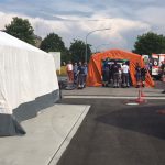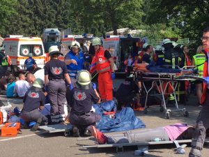 Deshalb fand am vergangenen Wochenende, am 9. Juni 2018, in enger Abstimmung mit den Katastrophenschutzbehörden des Rhein-Neckar-Kreises und der Stadt Heidelberg die DRK Kreisverbandsübung 2018 im Trainings Center Retten und Helfen (TCRH) in Mosbach statt – eine realistische Großschadenssimulation, die in dieser Größenordnung in der Region seit Jahren einzigartig ist. Etwa 500 Teilnehmer von Rettungsdienst, Schnelleinsatzgruppen Erstversorgung und Transport, fünf Einsatzeinheiten des Katastrophenschutzes, die Einsatzgruppe Psychosoziale Notfallversorgung, das Kreisauskunftsbüro und die Rettungshundestaffel zusammen mit Erstangriffskräften der Freiwilligen Feuerwehr des Rhein-Neckar-Kreises beteiligten sich. Die komplette Einsatzführung des DRK und zehn Notärzte unter Leitung des Leitenden Notarztes trainierten unter den Augen von Gästen aus Politik, Verbänden und Medien den Ernstfall.