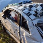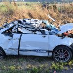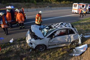 Das rechte Hinterrad platzte während der Fahrt. Der Abarth prallte gegen die Betonwand, krachte gegen einen Lastwagen und überschlug sich in der Böschung – Autobahn musste gesperrt werden – Hubschrauber im Einsatz
