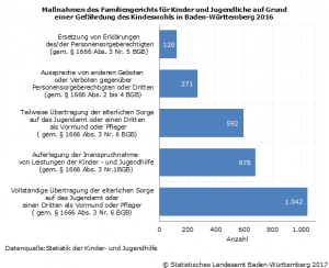 (zg) Nach Feststellung des Statistischen Landesamtes haben im Jahr 2016 die Familiengerichte in Baden‑Württemberg für 1 634 Kinder und Jugendliche die vollständige oder teilweise Übertragung der elterlichen Sorge auf das Jugendamt oder einen Dritten als Vormund oder Pfleger angeordnet. Dies bedeutet gegenüber dem Vorjahr (1 062) eine Steigerung um 54 %. Die Einschränkung oder der Entzug des Sorgerechts erfolgt, wenn eine Gefahr für das Wohl oder Vermögen des Minderjährigen auf andere Weise nicht abgewendet werden kann.