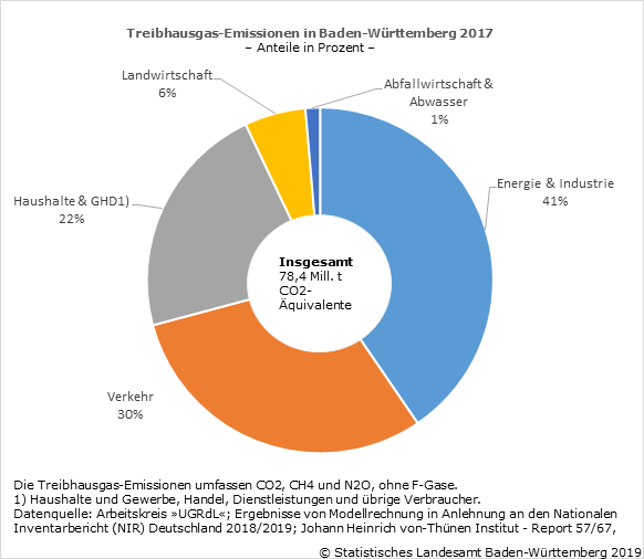 Treibhausgase: Nach vorläufigen Berechnungen des Statistischen Landesamtes lagen die Treibhausgas-Emissionen (Kohlendioxid, Methan und Lachgas) in Baden-Württemberg im Jahr 2017 bei rund 78,7 Millionen (Mill). Tonnen (t) und damit etwa auf Vorjahresniveau. Bis jetzt konnten in Baden-Württemberg gegenüber 1990 10,4 Mill. t CO2-Äquivalente (− 11,6 %) reduziert werden. Der Großteil dieser Treibhausgas-Emissionen 2017 stammte aus dem Verkehrsbereich (30 %), gefolgt vom Umwandlungssektor mit ca. 29 % (Erzeugung von Strom und Wärme) und dem Sektor »Haushalte und Gewerbe, Handel, Dienstleistungen und übrige Verbraucher (GHD)2« mit 22 %. Der Verkehrssektor ist der einzige Sektor in Baden-Württemberg, in dem die Treibhausgas-Emissionen gegenüber 1990 nicht reduziert werden konnten.
