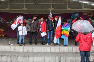 Dem Aufruf des Bündnisses für Toleranz zum Protest folgten trotz schlechten Wetters etwa 100 Gegendemonstranten, darunter junge Antifaschisten und Schüler. In der Allee an der Musikschule brachten die Teilnehmer, wie im Aufruf von 26 Organisationen, Parteien und Persönlichkeiten angekündigt, mit kreativen und fantasievollen Liedern ihren Unmut gegen die bizarre Nazi-Veranstaltung zum Ausdruck („In Sunisheim, im Elsenztal – ja, so warn’s/sind’s, die alten/neuen Nazi-Leut'“). In Redebeiträgen bekräftigten Vertreter des Bündnisses, von Grünen, SPD und Gewerkschaftern, weiterhin gegen dumpfe Nazipropaganda in Sinsheim vorzugehen.