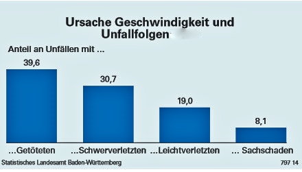 Mehr als ein Drittel der tödlichen Verkehrsunfälle geht auf überhöhte Geschwindigkeit zurück. „Innenminister Reinhold Gall: „Überhöhte oder nicht angepasste Geschwindigkeit ist bei schweren Verkehrsunfällen nach wie vor die Unfallursache Nummer EINS.
