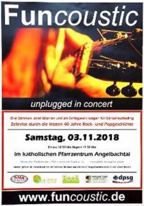 Pfadfinder veranstalten „Funcoustic“ Livekonzert im kath. Pfarrzentrum Angelbachtal, großer Saal unter der Kirche.