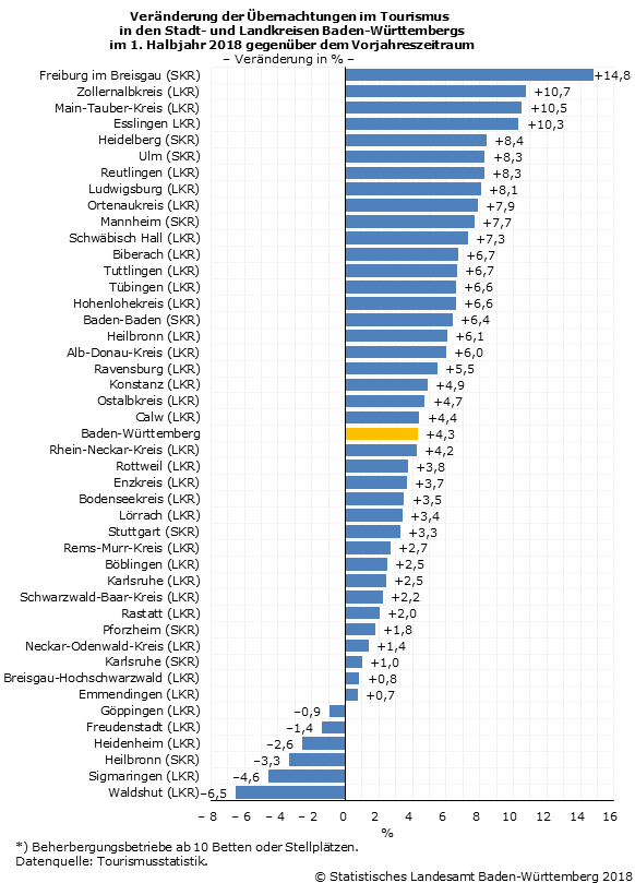 Die regionale Analyse zeigt, dass sich im ersten Halbjahr 2018 in fast allen Stadt- und Landkreisen Baden-Württembergs die Übernachtungszahlen gegenüber dem Vorjahreszeitraum erhöht haben. Nur 6 Stadt- und Landkreise konnten dieses Ziel nicht erreichen. Überdurchschnittliche Zuwächse bei den Übernachtungen konnten der Stadtkreis Freiburg (+14,8 %), der Zollernalbkreis (+10,7 %), der Main-Tauber-Kreis (+10,5 %) und der Landkreis Esslingen (+10,3 %) verbuchen. Weitere 18 Stadt- und Landkreise lagen ebenfalls über dem Landesdurchschnitt.