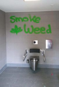 Die Innenwände der Behindertentoilette wurden mit Graffiti beschmiert und ein Spiegel wurde beschädigt.