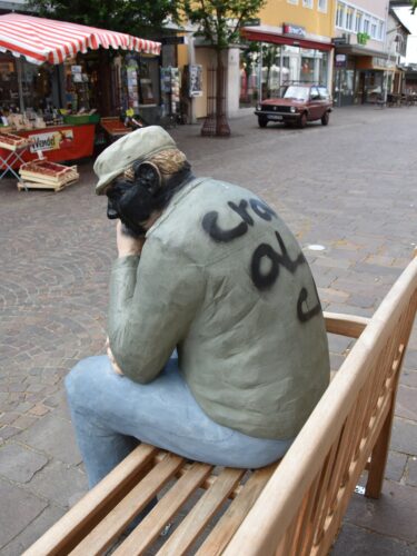 Am Montag, 13. Juni wurde die Stadtverwaltung Sinsheim am frühen Morgen auf die Verunstaltung der Skulptur „Opa auf Bank“ am Karlsplatz hingewiesen. Unbekannte haben das Gesicht der Figur komplett mit schwarzem Lack besprüht und auch Nacken und Rücken beschmiert. Ursprünglich einer von zwei „Opas“, saß diese Skulptur bereits seit Anfang Mai alleine auf der Bank, nachdem die zweite Skulptur entfernt werden musste, weil ihr ein Fuß abgebrochen worden war.