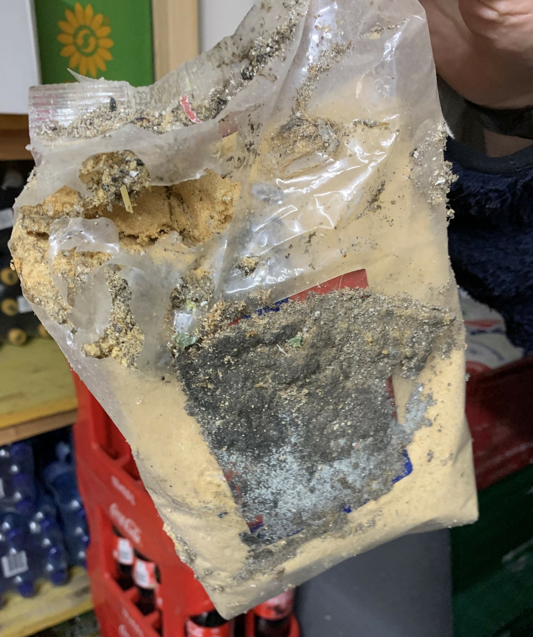 Verpacktes sowie offenes Fleisch zusammen mit einem stark verschimmelten Knochen in einem Restaurant.