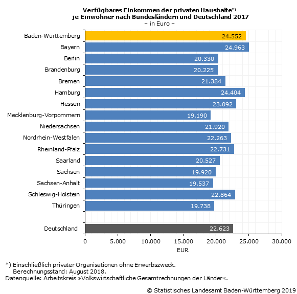 Das verfügbare Einkommen der privaten Haushalte in Baden-Württemberg erhöhte sich 2017 nach Angaben des Statistischen Landesamtes je Einwohner nominal um 2,4 % bzw. 570 Euro auf durchschnittlich 24 550 Euro. Dies zeigen aktuelle, vorläufige Ergebnisse des Arbeitskreises »Volkswirtschaftliche Gesamtrechnungen der Länder«. Angesichts der im Jahr 2017 um 1,6 % gestiegenen Verbraucherpreise fiel der Einkommenszuwachs real betrachtet entsprechend geringer aus. Bundesweit lag das nominale verfügbare Pro-Kopf-Einkommen mit 22 620 Euro 3,1 % über dem Vorjahreswert. Das verfügbare Einkommen der baden-württembergischen Haushalte bezogen auf die Einwohner war damit um 1 930 Euro höher als im Bundesdurchschnitt.