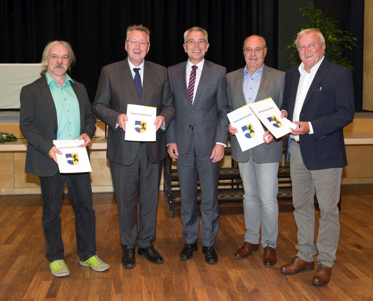 „Sie stehen für eine positive Entwicklung des Rhein-Neckar-Kreises und haben sich in herausragender Weise für das Wohl seiner Einwohnerinnen und Einwohner stark gemacht“: Landrat Stefan Dallinger hat in der Kreistagssitzung am Dienstag, 9. Juli 2019 in der Astoria-Halle in Walldorf drei Kreisräten und zwei ehemaligen leitenden Beamten den Ehrenring des Rhein-Neckar-Kreises verliehen