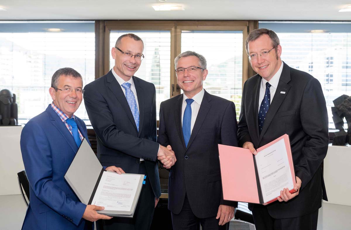von links: Peter Mülbaier, Geschäftsführer fibernet.rn Bernhard Palm, Geschäftsführer NetCom BW GmbH Landrat Stefan Dallinger Dr. Christoph Müller, Vorsitzender der Geschäftsführung, Netze BW GmbH Foto: fibernet.rn