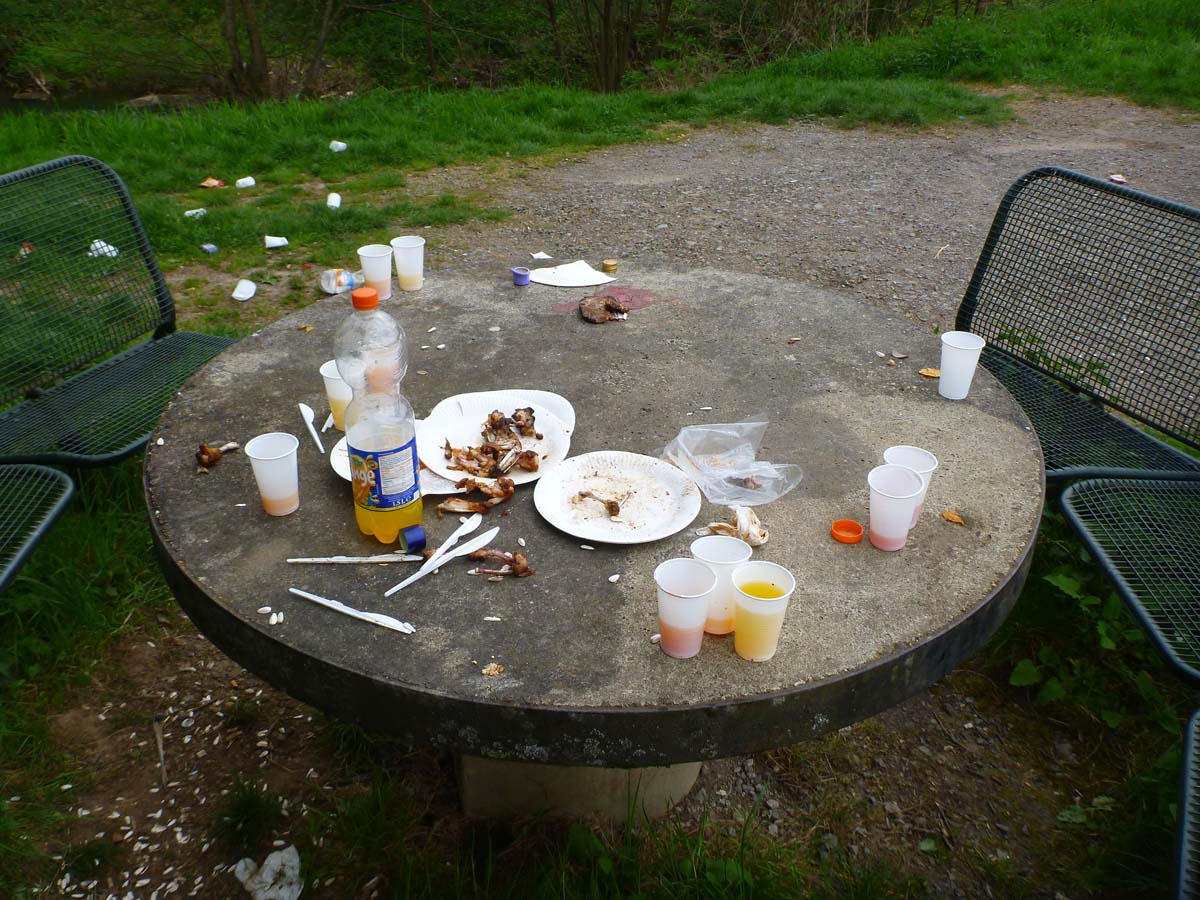 Ein trauriges Bild bot sich Bauhofleiter Walter Fickel, als er in der vergangenen Woche am Rastplatz Zeil vorbeifuhr. Jeglicher Müll in Form von Pappteller, Plastikbecher, Flaschen, Besteck, Böller und auch Lebensmittelreste wurden am Rastplatz liegen gelassen bzw. rund um den Rastplatz verteilt. Eine große Gruppe von Personen muss in der Zeit von Gründonnerstag bis Karfreitag, 13./14.04.2017 diesen Platz aufgesucht haben, um dort zu grillen und zu feiern.