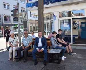 (Stadt Sinsheim): Oberbürgermeister Jörg Albrecht (M.) ließ sich beim Treffen mit Schülern und Lehrern ein erstes Probesitzen auf der nagelneuen Bank nicht nehmen