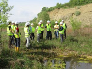 Zum Ende der Mitgliederversammlung wurden alle Anwesenden zur anschließenden Exkursion bei frühlingshaftem Wetter eingeladen. Dazu ging es in den Steinbruch von Neckarbischofsheim-Helmhof. Da der Steinbruch noch von HeidelbergCement genutzt wird, aber darin nicht mehr aktiv Steine gewonnen werden, wurden mit Helmen und Warnwesten die Sicherheitsstandards eingehalten. Im eingezäunten Steinbruch befinden sich Lebensräume und Laichplätze der Gelbbauchunken. Die Gelbbauchunke gilt als stark gefährdet. Darum hat der LEV gemeinsam mit einem Amphibienexperten vor Ort, Dr. Martin Berner, verschiedene Maßnahmen umgesetzt, um die Unkenpopulation zu fördern. Dabei wurden Tümpel angelegt. Auch wurden Gehölze entfernt, die die Kleinstgewässer zu stark beschatten würden, denn der Laich der Gelbbauchunke mag es eher sonnig. Anschließend wurden noch die Magerrasen im Steinbruch begutachtet, die mittels einer kontrollierten Beweidung vor der Verbuschung der Flächen offen gehalten werden sollen.
