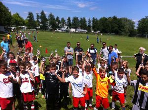 Ab 14:00 Uhr waren dann die jüngsten, die Bambinis im Einsatz. Hier kamen die Zuschauer voll auf ihre kosten. Schöne Tore und noch schönere Torjubel der verschiedensten Art bekamen sie zu sehen. Hin und wieder wurde auch vor lauter Jubeln vergessen, dass die gegnerische Mannschaft schon wieder angefangen und ebenfalls ein Tor erziehlt hatte. Die Ergebnisse waren zweitrangig und nur wenige wußten wie die Spiele eigentlich ausgingen. Aber letztendlich waren alle Gewinner und Namen mit strahlenden Augen ihren Siegerpokal entgegen.