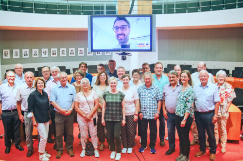 Höhepunkt war der gemeinsame Besuch im Deutschen Bundestag. Dort hatten die Besucherinnen und Besucher die Möglichkeit, nach einem Informationsgespräch auf der Besuchertribüne des Plenarsaals, mit dem Bundestagsabgeordneten Moritz Oppelt persönlich zu sprechen, wenn auch nur virtuell, da der Abgeordnete aufgrund seiner Corona-Erkrankung leider nicht nach Berlin reisen konnte. Zu Beginn des Gesprächs, welches im Sitzungssaal des Ausschusses für Arbeit und Soziales stattfand, dankte Brunnemer im Namen der Gruppe für die Einladung nach Berlin und fragte nach der grundsätzlichen Stimmung in der CDU-Bundestagsfraktion nach einer Zeit geprägt von Veränderungen.