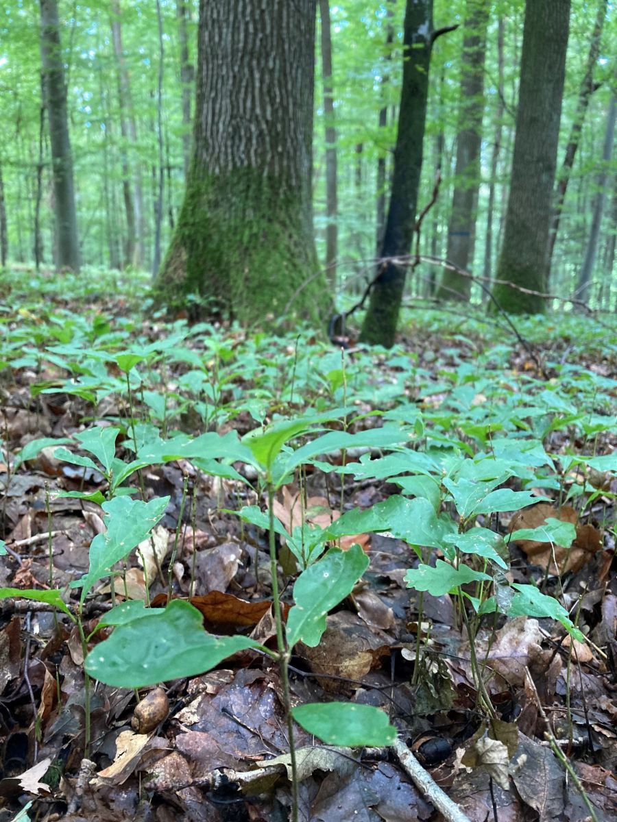 Junge Eichensämlinge – im Hintergrund eine der Eichen, von denen bald Saatgut im Stadtwald Sinsheim geerntet werden kann. Aufgenommen von Elena Motschilnig, Kreisforstamt.